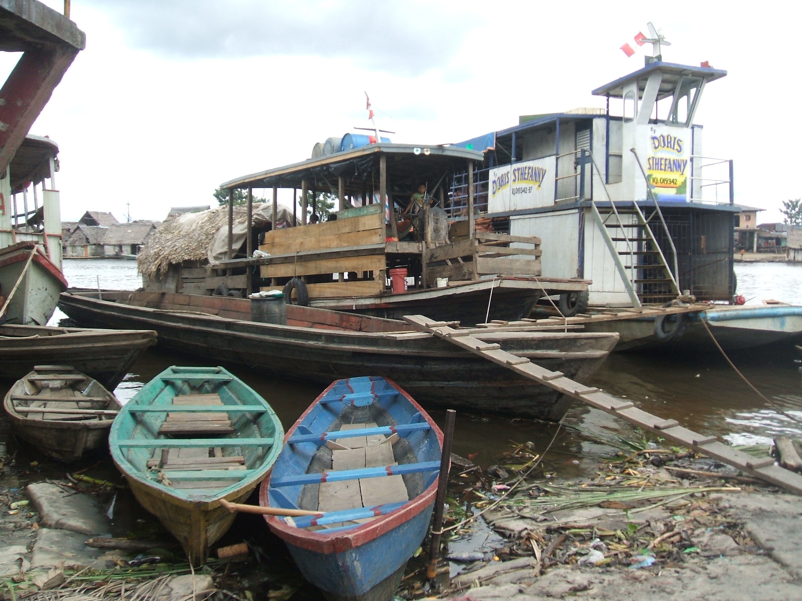 Autora: María Teresita de Haro, serie: Relatos de dos mundos. Embarcaciones ancladas en la orilla del río. Barcas de todo tipo surcan los ríos amazónicos acarreando vituallas y personas.